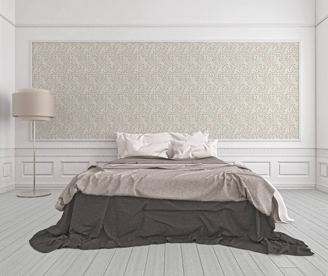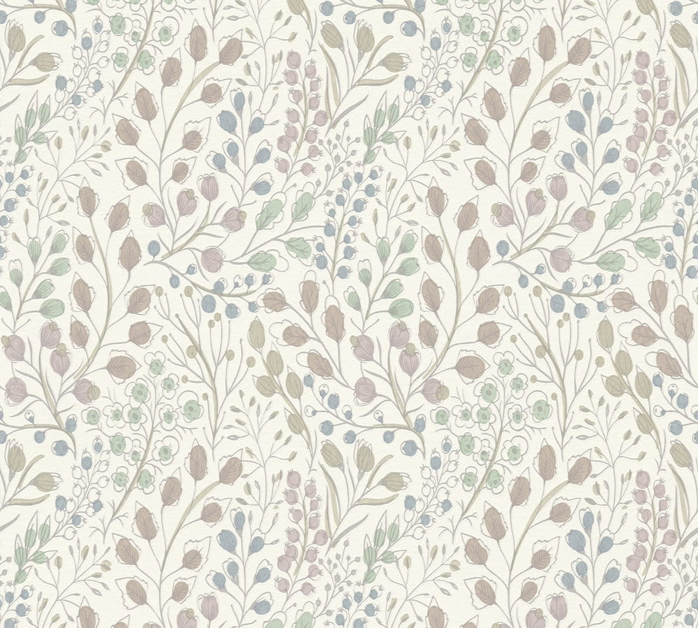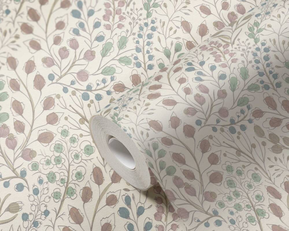 Tapeta z drobnym motywem listków i kwiatków, zachowana w stonowanej i pastelowej kolorystyce. Delikatne gałązki, pnącza letnich kwiatów wyglądają na ręcznie malowane. Tapeta zdecydowanie odświeży pomieszczenie i sprawi, że będzie radosne i przytulne.