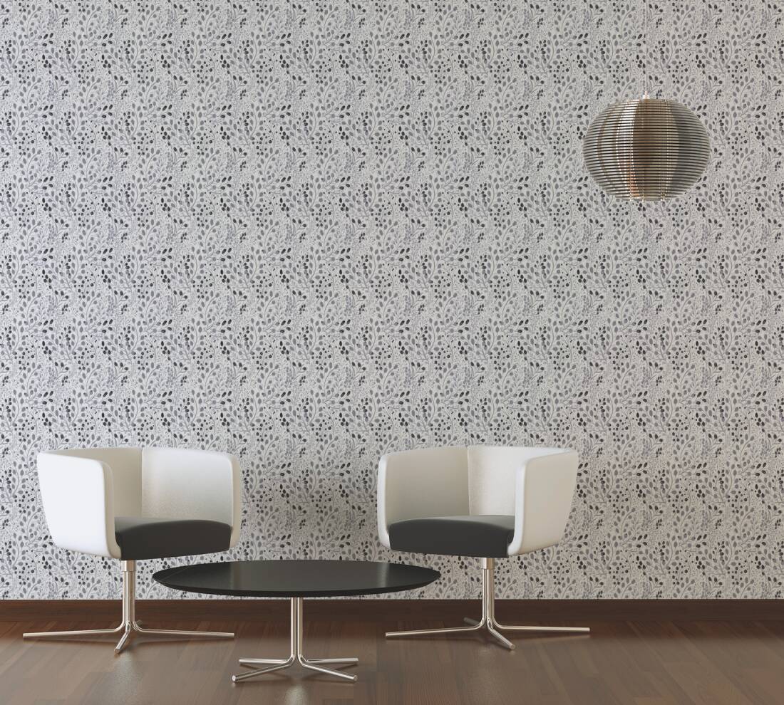 Powierzchnia tapety jest matowa, w białym kolorze, elementy wzoru są subtelnie połyskujące w kolorystyce szaro czarnej.