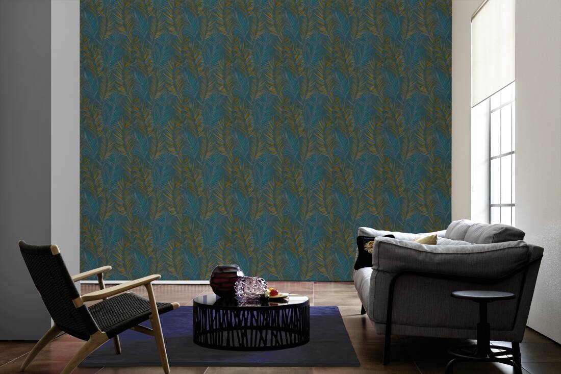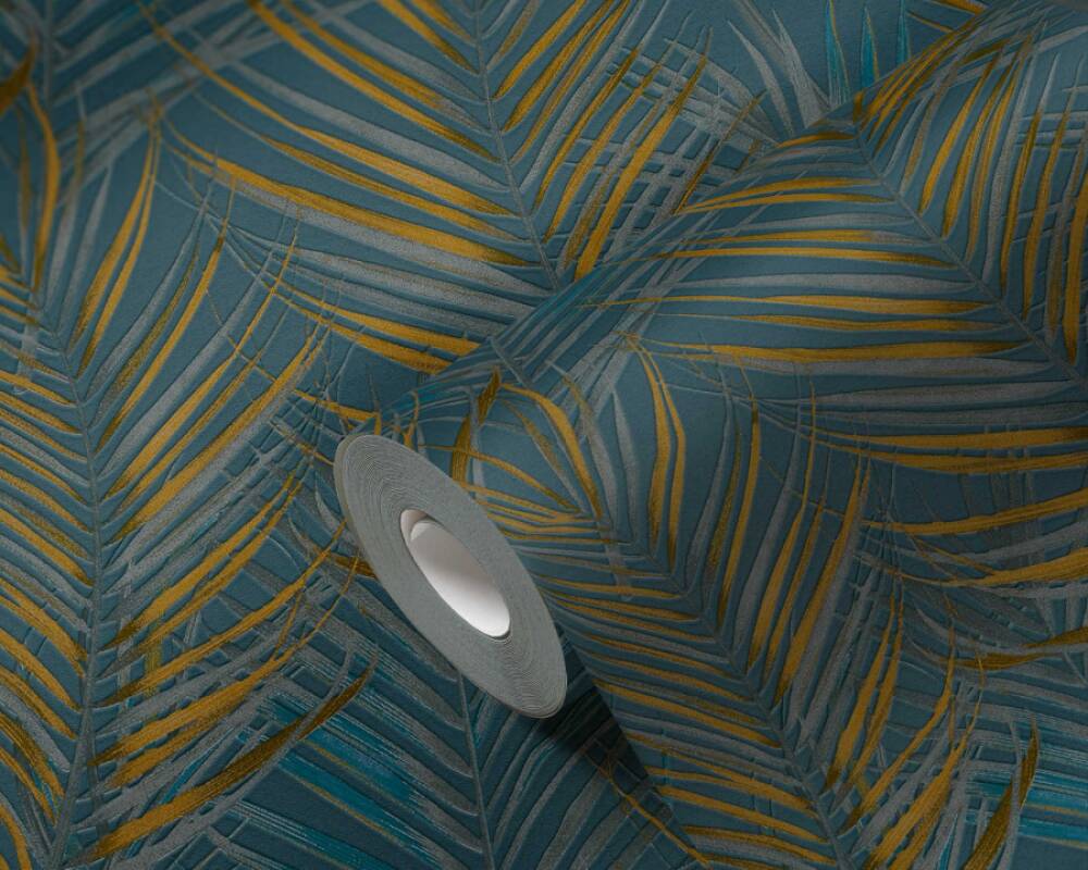 Tło tapety jest matowe i jednolite, w kolorze turkusowym. Wzór jest w kilku odcieniach turkusu, popieli i złoto-żółtego oraz posiada połyskującą poświatę, która mieni się pod wpływem światła.
