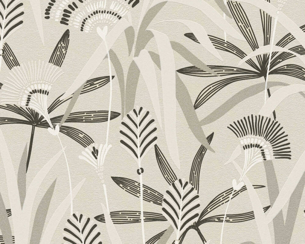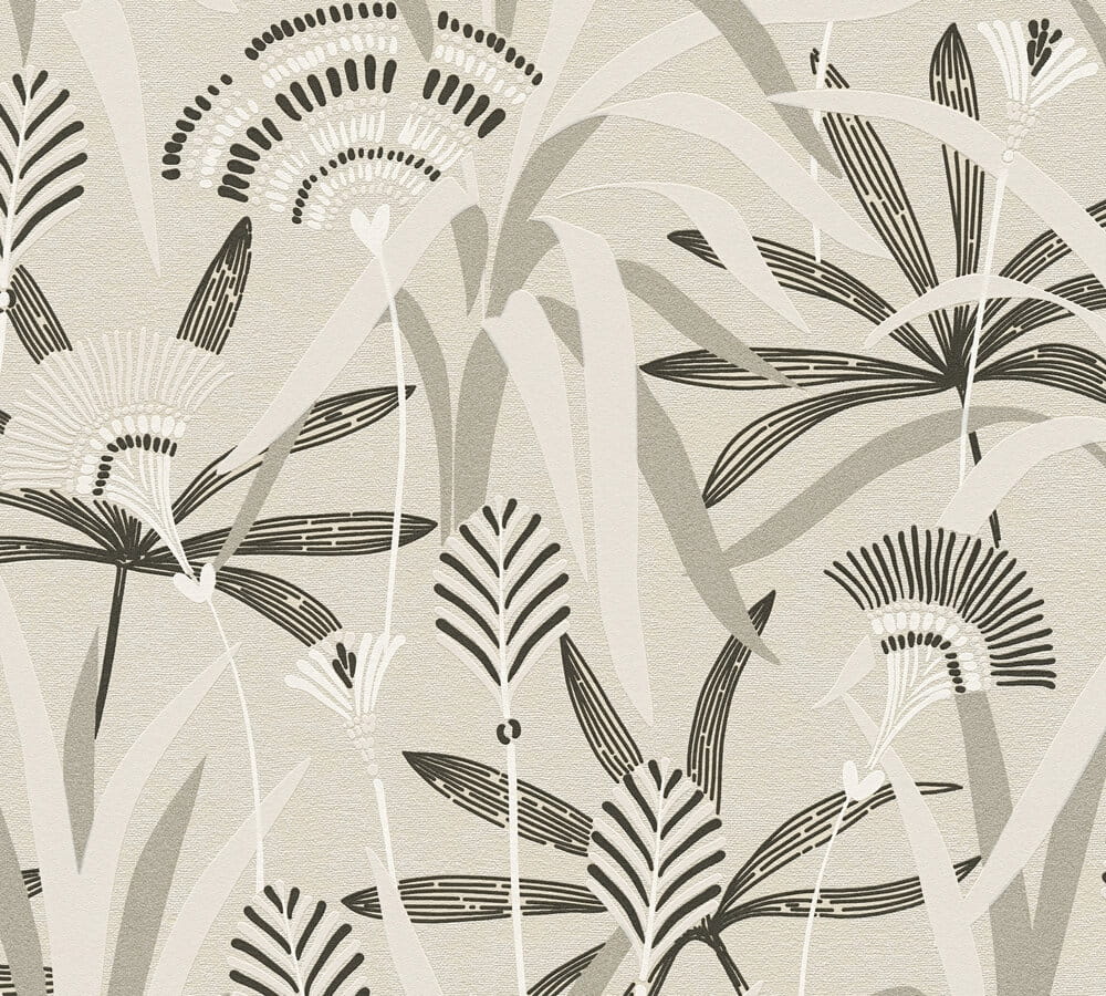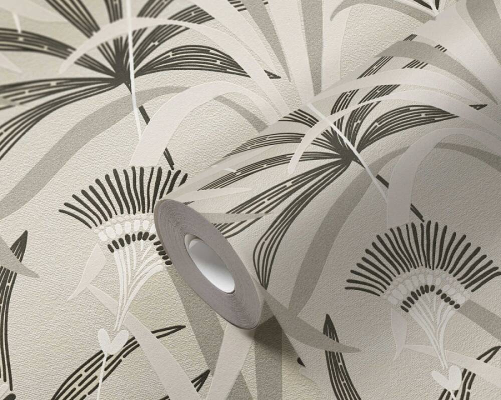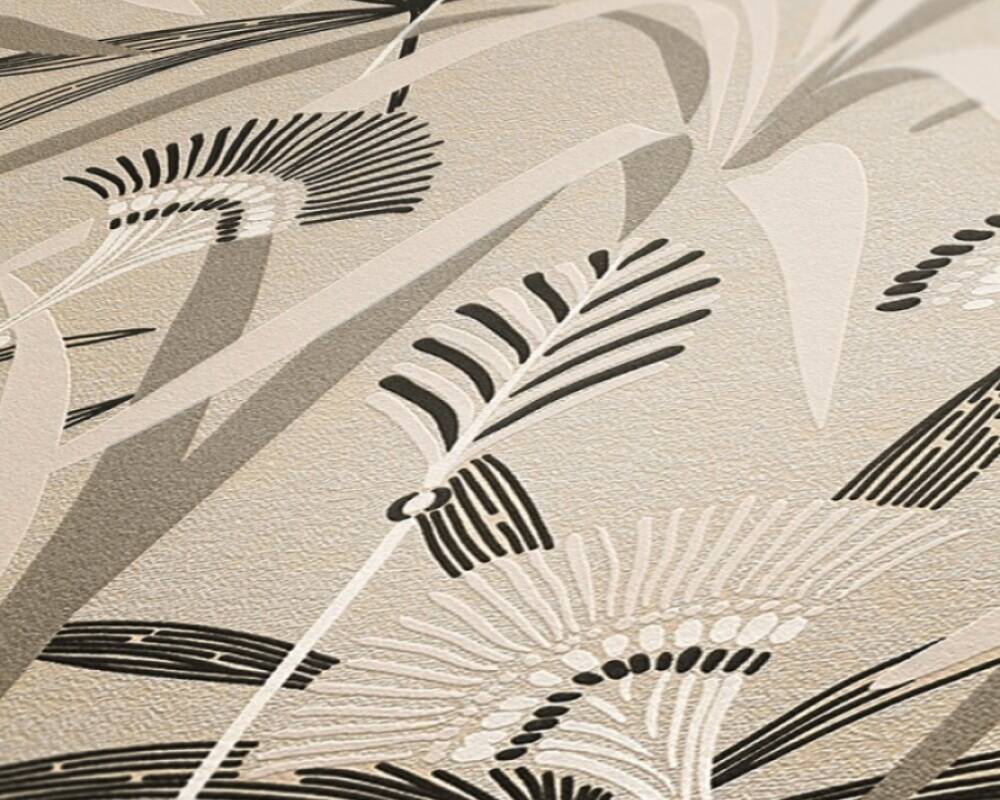 Prezentowaną tapetę ścienną z kolekcji "French Affair" od A.S. Creation wyróżnia wyrazisty wzór w stylu art deco, inspirowany tropikalną roślinnością. Motywem przewodnim są liście i kwiaty, które zostały przedstawione w artystycznym, nowoczesnym wydaniu. Elementy w spokojnych odcieniach szarości, czerni i bieli kontrastują z delikatnym, jasnobeżowym tłem, które nadaje kompozycji eleganckiego charakteru. Szare liście mają metaliczne wykończenie, dzięki czemu subtelnie odbijają światło tworząc efekt głębi i refleksy. Faktura powierzchni jest miękka, gąbczasta i nieco szorstka w dotyku, elementy wzoru są lekko wyczuwalne pod palcami.