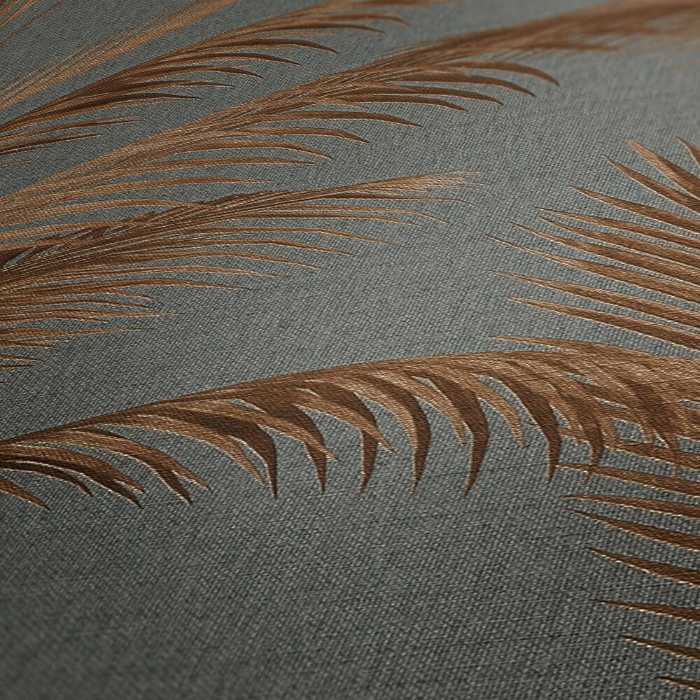 Powyższa tapeta ścienna z motywem liści palmowych to doskonały wybór dla osób, które marzą o przytulnej ale i eleganckiej aranżacji wnętrza. Subtelny, roślinny wzór brązowych liści, ułożonych w pióropusze na ciemnoszarym tle wprowadzi do wnętrza atmosferę spokoju i relaksu, nadając jednocześnie pomieszczeniu wyjątkowego charakteru. Wzór a dokładniej jego jaśniejsze elementy mają subtelnie błyszczące, metaliczne wykończenie, które nadaje tapecie luksusowy wygląd. Odbijające się światło subtelnie podkreśla detale wzoru, nadając ścianom głębi. Delikatnie tłoczona, wyraźnie szorstka struktura tapety imituje luźno tkane płótno, co podkreśla naturalny styl kompozycji. Tapeta swym stylem świetnie odnajdzie się zarówno w nowoczesnych, jak i bardziej klasycznych aranżacjach. Doskonale sprawdzi się jako dekoracja salonu, sypialni, czy też biura. Zastosowanie tapety jako dekoracji jednej ściany i zestawienie jej z tapetami jednokolorowymi, które prezentujemy poniżej pozwoli uzyskać spójny i harmonijny wystrój wnętrza. Prezentowana tapeta jest tapetą winylowa na flizelinie, odporną na szorowanie, dzięki czemu łatwą do utrzymania w czystości. Produkt pochodzi z katalogu "Michalsky 6", niemieckiego producenta A.S Creation.