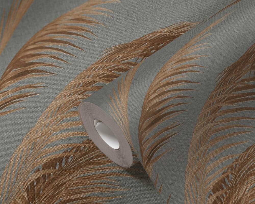Powyższa tapeta ścienna z motywem liści palmowych to doskonały wybór dla osób, które marzą o przytulnej ale i eleganckiej aranżacji wnętrza. Subtelny, roślinny wzór brązowych liści, ułożonych w pióropusze na ciemnoszarym tle wprowadzi do wnętrza atmosferę spokoju i relaksu, nadając jednocześnie pomieszczeniu wyjątkowego charakteru. Wzór a dokładniej jego jaśniejsze elementy mają subtelnie błyszczące, metaliczne wykończenie, które nadaje tapecie luksusowy wygląd. Odbijające się światło subtelnie podkreśla detale wzoru, nadając ścianom głębi. Delikatnie tłoczona, wyraźnie szorstka struktura tapety imituje luźno tkane płótno, co podkreśla naturalny styl kompozycji. Tapeta swym stylem świetnie odnajdzie się zarówno w nowoczesnych, jak i bardziej klasycznych aranżacjach. Doskonale sprawdzi się jako dekoracja salonu, sypialni, czy też biura. Zastosowanie tapety jako dekoracji jednej ściany i zestawienie jej z tapetami jednokolorowymi, które prezentujemy poniżej pozwoli uzyskać spójny i harmonijny wystrój wnętrza. Prezentowana tapeta jest tapetą winylowa na flizelinie, odporną na szorowanie, dzięki czemu łatwą do utrzymania w czystości. Produkt pochodzi z katalogu "Michalsky 6", niemieckiego producenta A.S Creation.
