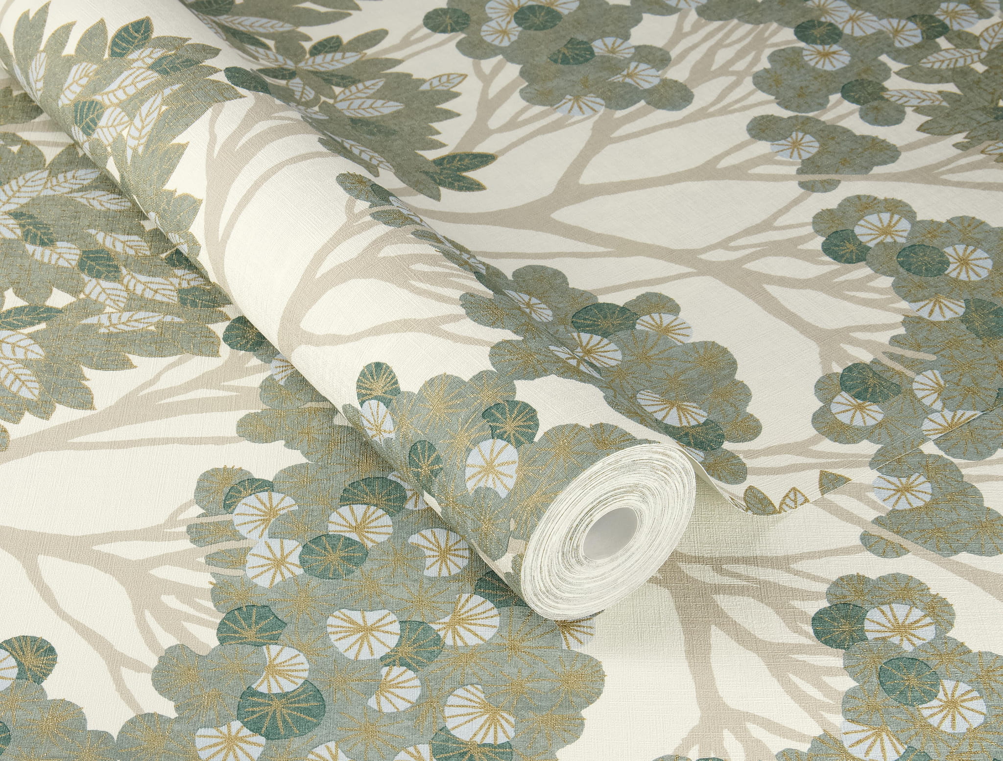 Prezentowana tapeta ścienna zachwyci miłośników natury oraz subtelnych akcentów, które tworzą atmosferę ciepła i harmonii. Wzór inspirowany naturalnym pejzażem przedstawia liście i gałęzie drzew w stonowanych odcieniach szarawej zieleni oraz jasnej szarości i błękitu, które wypełniają białe tło. Metaliczne, złote kontury i detale wzoru delikatnie połyskują w świetle, dodając głębi elementom wzoru. Efekt jest elegancki i subtelny, nieprzytłaczający wnętrza. Struktura tapety przypomina płócienną tkaninę, co dodaje jej przytulności i subtelnej tekstury, jednocześnie sprawiając, że wzór wydaje się bardziej miękki i naturalny.