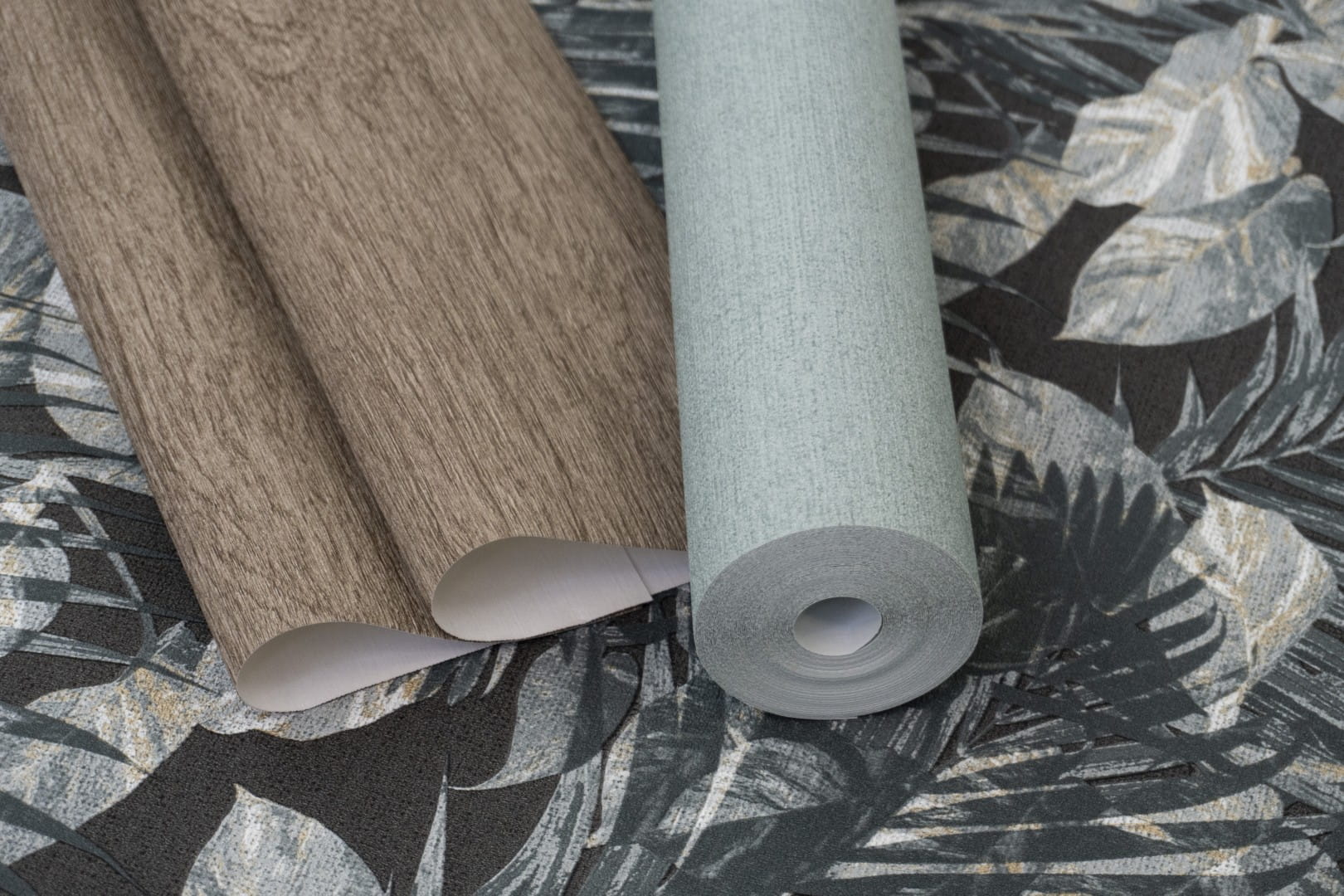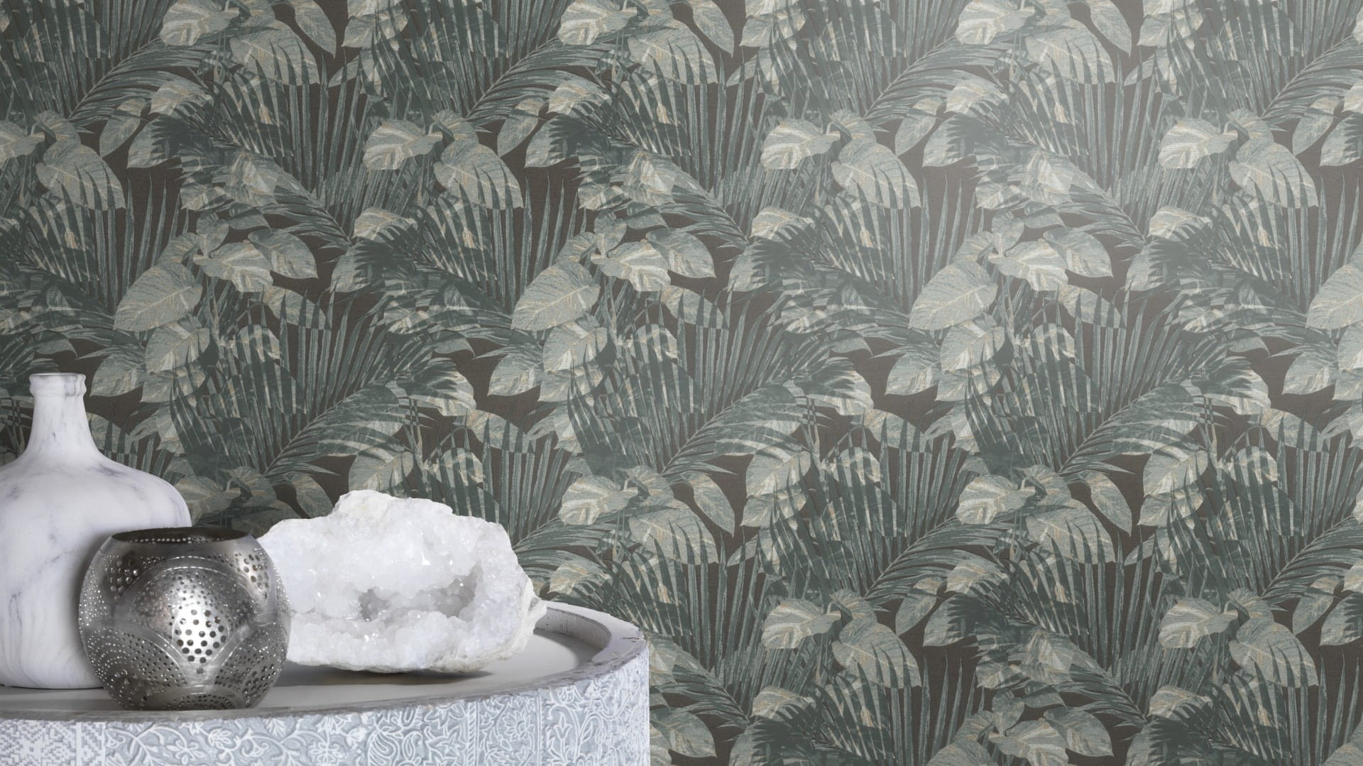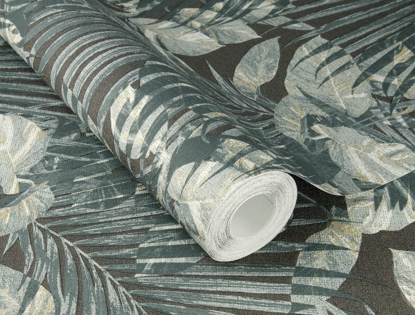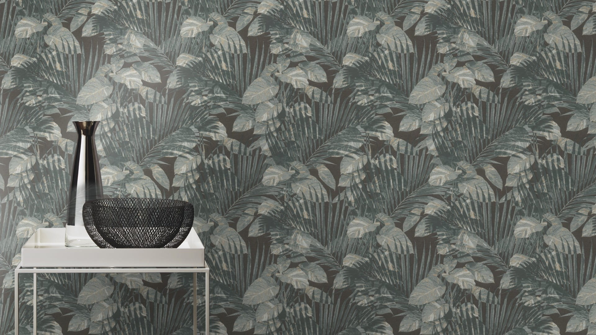 Prezentowana tapeta ścienna przyciąga wzrok tropikalnym wzorem, który wprowadzi do wnętrza harmonię, przytulność i subtelny element egzotyki. Wzór składa się z gęsto rozmieszczonych liści palmowych i tropikalnych roślin, które przeplatają się, tworząc dynamiczną kompozycję. Liście wyróżniają się realistycznymi detalami, podkreślonymi gdzieniegdzie subtelnym, złotym połyskiem. Kolorystyka tapety obejmuje chłodne, niebiesko-szarawe tony, zestawione z szarością i akcentami bieli, wkomponowane w ciemne, antracytowe tło. Struktura tapety przywołuje na myśl grube płótno o wyczuwalnie szorstkiej powierzchni.
