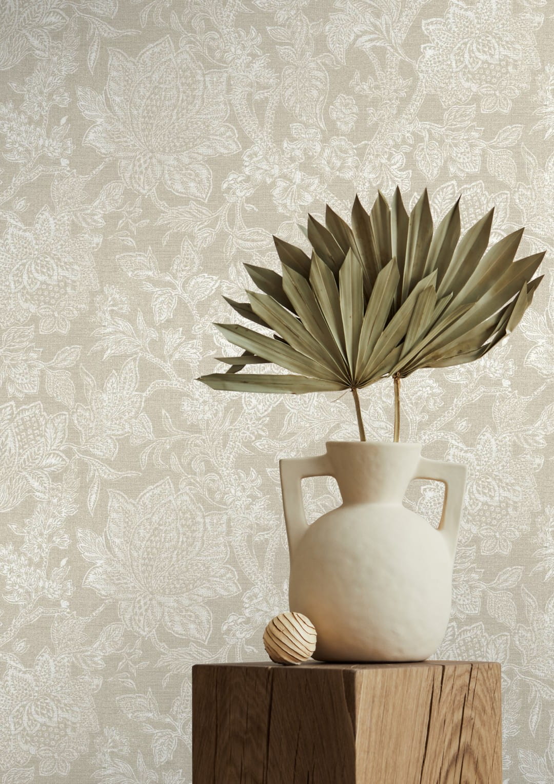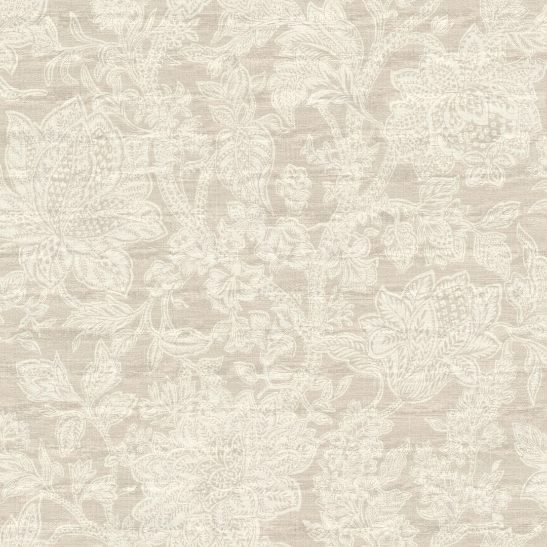 Prezentowana tapeta ścienna to kwintesencja elegancji i subtelnego stylu, która doskonale sprawdzi się, zarówno w klasycznych, jak i nowoczesnych wnętrzach. Jej struktura imitująca płótno o matowym wykończeniu nadaje powierzchni delikatny, tekstylny charakter, co sprawia, że wzór wygląda wyjątkowo naturalnie i subtelnie. Tapeta przedstawia stylizowany, kwiatowy motyw w odcieniu bieli, na delikatnym, jasnobeżowym tle, dzięki czemu wnętrze zyska przytulny i harmonijny wygląd.