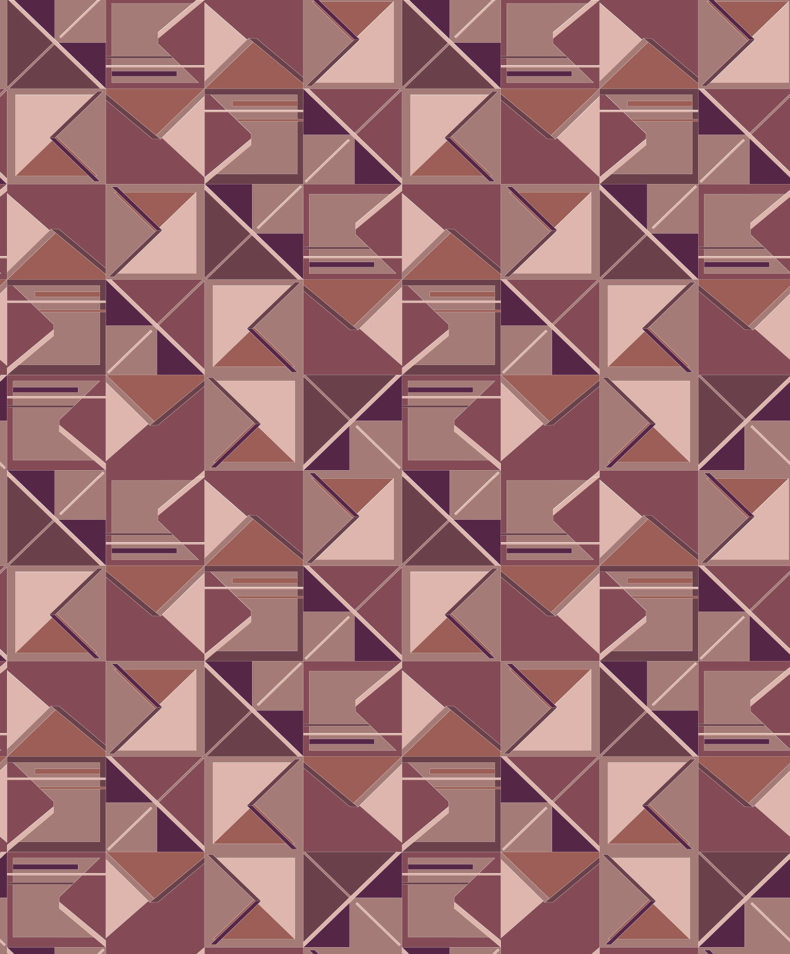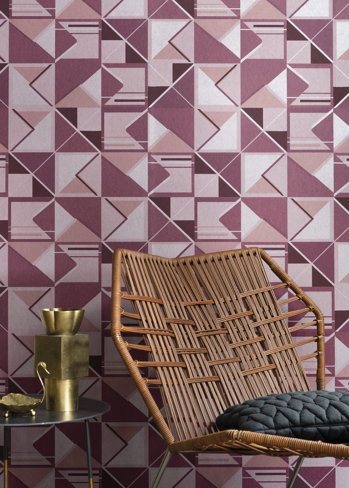 Tapeta z geometrycznym wzorem w stylu Art-Deco, składającym się w z trójkątnych i czworokątnych figur, które układają się w kwadraty. Projekt utrzymany w spokojnych, przygaszonych odcieniach fioletu wpadającego w bordo, fioletu złamanego szarością i różu. Tapeta ma wygląd tkaniny, która przypomina betonową powierzchnię, faktura powierzchni jest gładka, pod palcami można wyczuć gdzieniegdzie najdrobniejsze elementy. Fioletowo-szare trójkąty mają srebrny, metaliczny połysk i pięknie odbijają światło, dzięki czemu tapeta się mieni, co dodaje dynamiki i tworzy refleksy na ścianie. Tapeta świetnie sprawdzi się jako dekoracja jednej ściany, tworząc modne zestawienie z tapetami, które prezentujemy poniżej. W wyjątkowy sposób odmieni styl salonu, jadalni, sypialni, pokoju młodzieżowego, przedpokoju, czy też biura. Świetnie sprawdzi się przy aranżacji wnętrza nowoczesnego, minimalistycznego, czy na przykład urządzonego w stylu retro. Projekt „Square”, pochodzący z ekskluzywnej kolekcji „Boheme”, producenta Decoprint jest dostępny w czterech wersjach kolorystycznych. Tapeta winylowa na podłożu flizelinowym, zmywalna w dobrym stopniu. Zdjęcie przykładowej aranżacji lepiej oddaje rzeczywistą kolorystykę tapety.