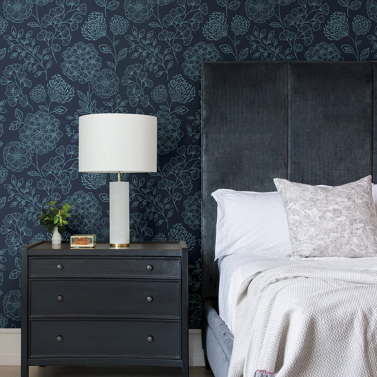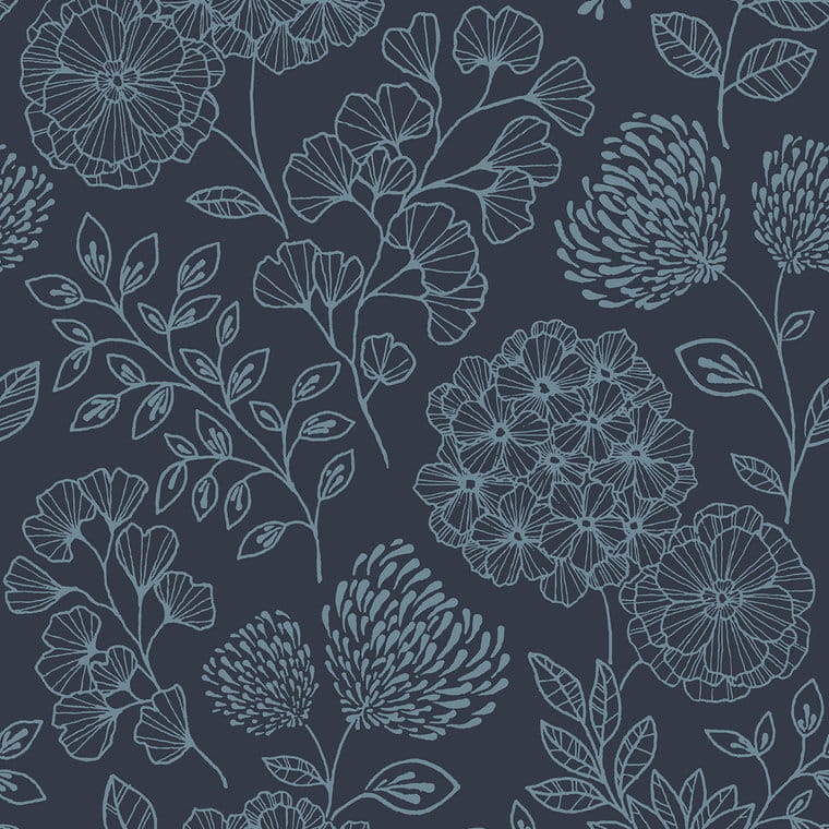 Nowoczesna tapeta ścienna z graficznym wzorem roślinnym. Niebieski motyw składający się z kwiatów i listków o różnorodnych formach wypełnia gęsto ciemne, granatowe tło. Struktura tapety jest gładka a wykończenie matowe. Przytulna dekoracja, która idealnie skomponuje się z wystrojem salonu, jadalni, sypialni, przedpokoju oraz młodzieżowego wnętrza. Projekt dostępny w wielu wersjach kolorystycznych, prezentowanych poniżej. Tapeta pochodzi z kolekcji „Scott Living II By Drew & Jonathan”, producenta Fine Decor. Jest tapetą winylową na podłożu flizelinowym, zmywalną w dobrym stopniu.