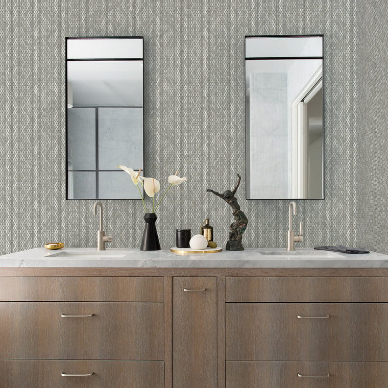 Ekskluzywna tapeta ścienna z kolekcji "Scott Living II By Drew & Jonathan", producenta Fine Decor. Tapeta ścienna o wyglądzie grubej, plecionej tkaniny, z utkanym, delikatnym deseniem geometrycznym, który układa się w romby. Kompozycję wyróżnia delikatna kolorystyka, łącząca odcienie szarości z szarym beżem i bielą. Kolory delikatnie przenikają się, co tworzy wizualnie bardzo oryginalny efekt i dodaje dynamiki ścianom. Powierzchnia tapety jest niemal idealnie gładka, pod palcami można wyczuć tylko białe elementy wzoru, wykończenie tapety jest matowe. Przytulna i elegancka dekoracja, która idealnie skomponuje się z wystrojem wnętrza nowoczesnego, czy urządzonego na przykład w stylu Etno. W wyjątkowy sposób odmieni styl salonu, jadalni, sypialni, przedpokoju, biura, czy też pokoju młodzieżowego. Podłoże tapety winylowe na flizelinie, zmywalne w dobrym stopniu.