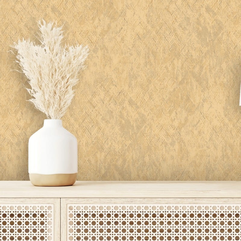 Tapeta winylowa na flizelinie z kolekcji "Nomade" producenta Ugepa. Wzór inspirowany skórą węża, w stonowanych odcieniach żółtej ochry, ze złotymi, metalizowanymi akcentami. Struktura tapety jest bardzo delikatnie tłoczona, niemalże gładka w dotyku, wyczuwalnie szorstka. Dekoracja, która idealnie pasuje do wnętrz urządzonych w stylu etno, jak i tych o nowoczesnym charakterze. Sprawi, że salonie, jadalni, sypialni, czy też przedpokoju zapanuje wyjątkowo przytulna atmosfera. Tapeta z powodzeniem sprawdzi się jako samodzielna dekoracja w całym pomieszczeniu, może też z powodzeniem być łączona w modne kompozycje z innymi tapetami z kolekcji i być zastosowana na przykład jako dekoracja na jednej, czy też dwóch ścianach. Modne zestawienie tworzy z tapetami o numerach: M32805, M66007.