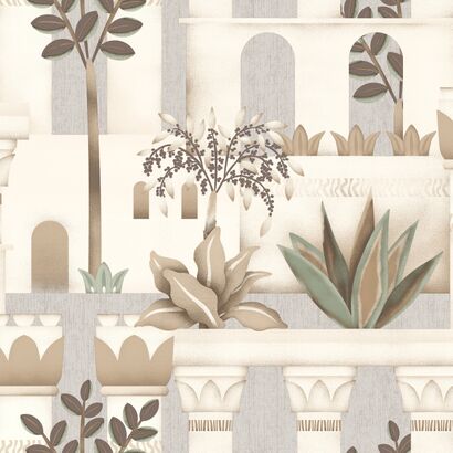Tapeta winylowa na flizelinie z kolekcji "Nomade", producenta Ugepa. Motyw w stylu etno inspirowany śródziemnomorską stylistyką, utrzymany w stonowanej kolorystyce. Drzewa i sukulenty na tle egipskiej architektury mają tutaj spokojne odcienie ecru, beżu, brązu, szarości i zieleni. Delikatnie tłoczona struktura tapety imituje tkaninę, wykończenie jest matowe. Dekoracja, która ożywi wnętrze i sprawi, że aranżacja nabierze przytulnego i odprężającego charakteru. W oryginalny sposób odmieni styl salonu, jadalni, sypialni, a nawet kuchni, czy też łazienki. Świetnie będzie współgrać z meblami i dodatkami wykonanymi z naturalnych materiałów i w neutralnych kolorach. Aby uzyskać spójną aranżację wnętrza warto zastosować tapetę jako dekorację jednej ściany i zestawić z pasującymi do niej tapetami o numerach: M61914 i M33404.