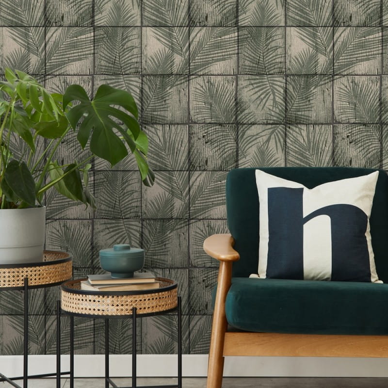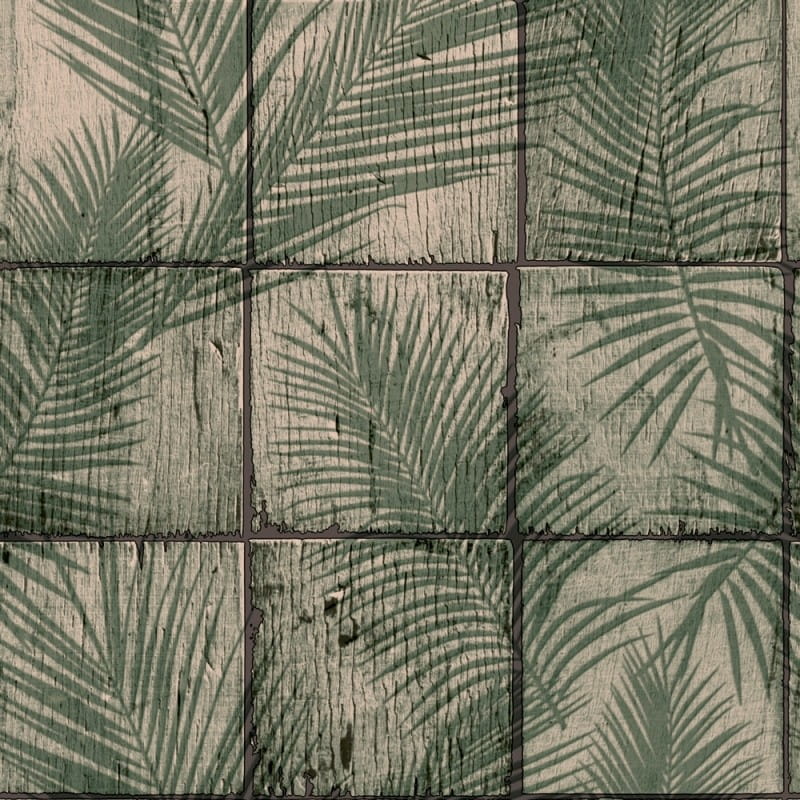 Tapeta winylowa na flizelinie z kolekcji "Nomade" producenta Ugepa. Oryginalne połączenie wzoru roślinnego z motywem drewna. Kompozycja przedstawiająca liście palmowe namalowane na dużych, drewnianych kostkach z pewnością zapewni przytulną atmosferę w pomieszczeniu. Naturalny styl tapety podkreśla spokojna kolorystyka, będąca zestawieniem ciemnej zieleni z jasnym beżem i czernią. Struktura tapety jest bardzo delikatnie tłoczona i ma matowe wykończenie. Tapetę warto zastosować jako dekorację jednej ściany i zestawić z tapetami o numerach: M33407 i M64907, co pozwoli uzyskać spójną i modną aranżację wnętrza.