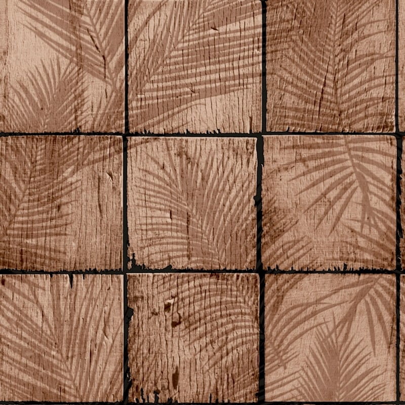 Tapeta winylowa na flizelinie z kolekcji "Nomade" producenta Ugepa. Oryginalne połączenie wzoru roślinnego z motywem drewna. Kompozycja przedstawiająca liście palmowe namalowane na dużych, drewnianych kostkach z pewnością zapewni przytulną atmosferę w pomieszczeniu. Naturalny styl tapety podkreśla spokojna kolorystyka, będąca zestawieniem beżu z brązem i czernią. Struktura tapety jest bardzo delikatnie tłoczona i ma matowe wykończenie. Tapetę warto zastosować jako dekorację jednej ściany i zestawić ją na przykład z tapetą o numerze: M61905 i M33419, co pozwoli uzyskać spójną i modną aranżację wnętrza.