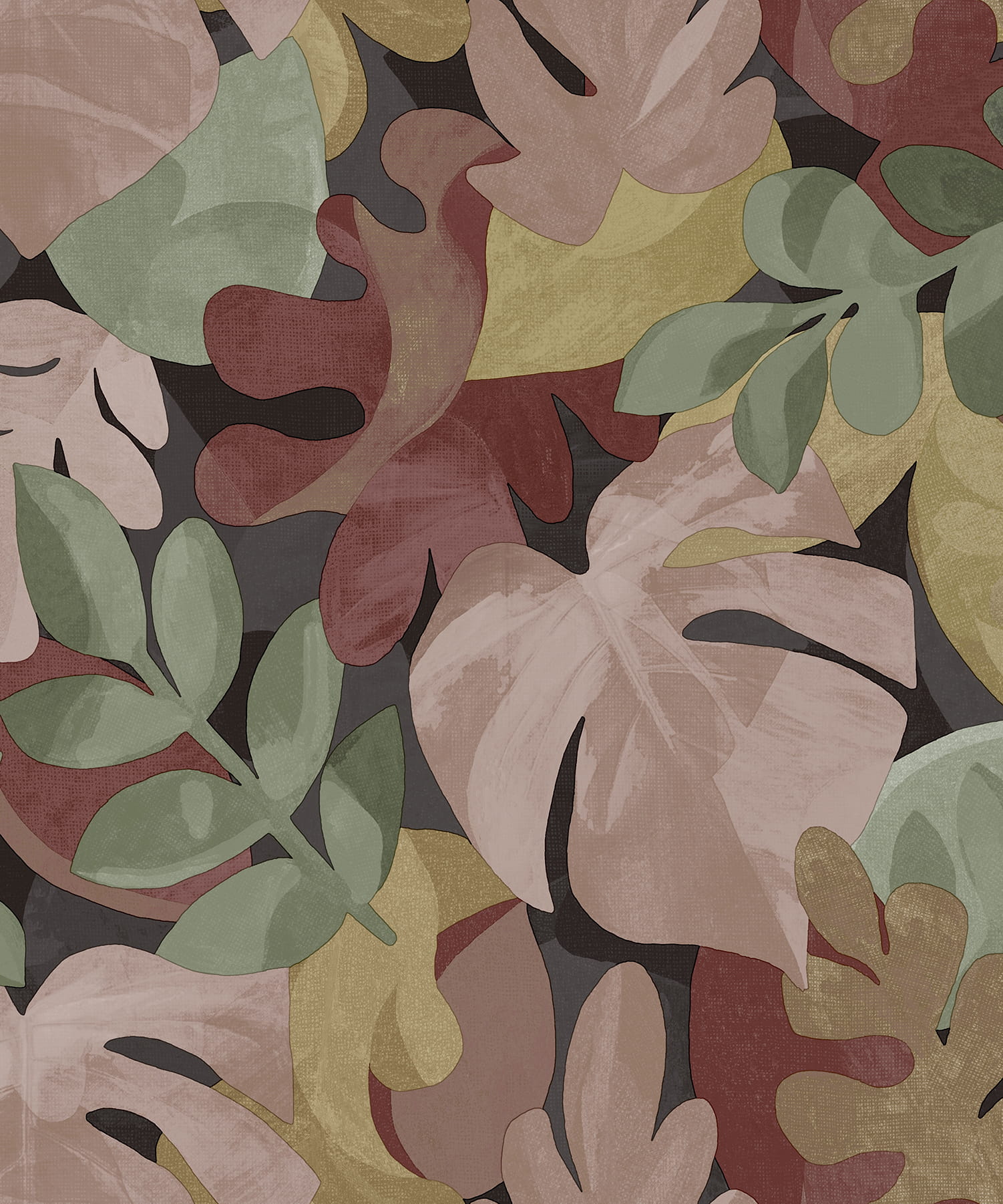 Prezentowaną tapetę ścienną wyróżnia wzór dużych, tropikalnych liści, utrzymany w odcieniach bordowego, oliwkowej zieleni, musztardy, przygaszonego różu i brązu, kontrastujących z czarnym tłem. Dzięki kontrastowym barwom tapeta jest wyrazista i przyciąga wzrok. Struktura tapety jest gładka a wykończenie matowe. Tapeta doskonale wpasuje się do wnętrz nowoczesnych, boho, eklektycznych, czy urządzonych w stylu urban jungle. Idealnie pasuje do salonu, jadalni, sypialni, czy też przedpokoju. Świetnie sprawdzi się jako dekoracja na jednej ścianie, jak i jej fragmencie, na przykład jako akcent za łóżkiem, czy sofą. Stworzy przyjemną atmosferę w pomieszczeniu, dodając wnętrzu lekkości i elegancji. Świetnie będzie współgrać z meblami i dodatkami wykonanymi z naturalnych materiałów. Tworzy świetnie tło dla aranżacji opartej na neutralnych kolorach i naturalnych materiałach. Zestawienie tapety z produktami, które prezentuje poniżej pozwoli uzyskać spójną i stylową aranżację. Tapeta pochodzi z ekskluzywnej kolekcji "Perfect Harmony", belgijskiego producenta Grandeco. Tapeta flizelinowa, ekologiczna - bez dodatku PCV, zmywalna.