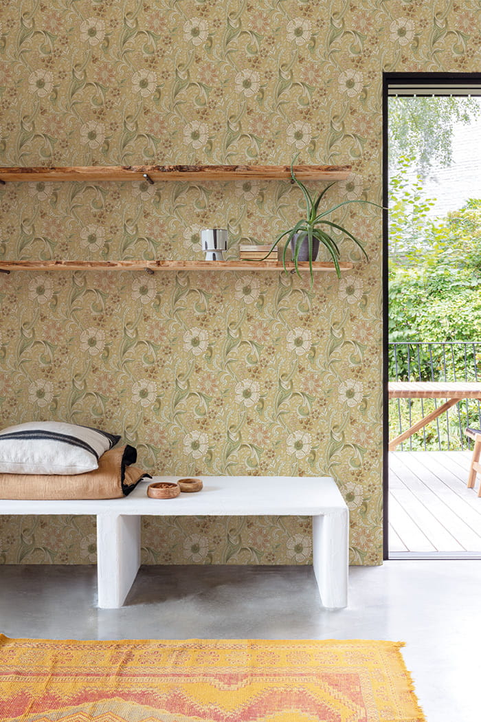 Prezentowana tapeta ścienna ma elegancki, florystyczny wzór inspirowany stylem vintage. Precyzyjny, bogaty w detale deseń dużych kwiatów i wijących się liści przywołuje na myśl klasyczny styl angielskich wnętrz. Kolorystyka tapety to ciepłe, naturalne odcienie beżu, brązu, oliwkowej zieleni i kremowej bieli, które tworzą elegancką i przytulną kompozycję. Powierzchnia tapety jest gładka ale fakturą przypomina tkaninę, wykończenie powierzchni jest matowe. Swym stylem tapeta doskonale nadaje się do wnętrz urządzonych w stylu klasycznym, vintage, romantycznym ale również i nowoczesnym. Idealnie pasuje do salonu, sypialni, przedpokoju, czy gabinetu. Sprawi, że każde wnętrze nabierze klasy i wyjątkowego charakteru. Jest idealnym wyborem dla osób, które kochają elegancję, naturalne motywy i klasyczne wnętrza o wyrafinowanym stylu. Warto zestawić ją z drewnianymi meblami w naturalnych odcieniach, dodatkami w stylu retro i tkaninami w stonowanych barwach, aby stworzyć harmonijną aranżację. Tapeta pochodzi z ekskluzywnej kolekcji "Perfect Harmony", belgijskiego producenta Grandeco. Tapeta flizelinowa, ekologiczna - bez dodatku PCV, zmywalna.