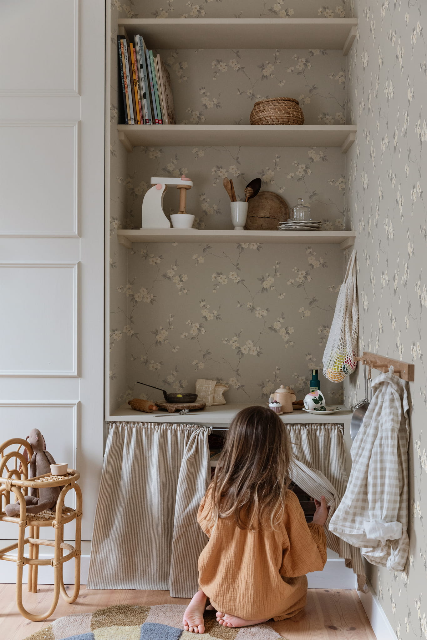 Ekskluzywna tapeta ścienna z kolekcji "Villa Dallarö II", szwedzkiego producenta Sandberg. Projekt "Engla" to delikatny, malowany pędzlem motyw roślinny, przedstawiający kwitnące gałązki jabłoni. Kompozycję charakteryzuje delikatna kolorystyka, dzięki której całość jest lekka i przytulna w odbiorze. Wzór w delikatnych szarościach, ciepłym beżu i bieli został wkomponowany w jasnoszare tło. Wykończenie tapety jest matowe a jej struktura niemal idealnie gładka. Pod palcami można nieco wyczuć elementy wzoru, które zostały delikatnie wytłoczone. Idealny przepis na stworzenie aranżacji o ciepłym i odprężającym charakterze. Tapeta świetnie nadaje się zarówno do klasycznych, jak i nowoczesnych wnętrz. Doskonale skomponuje się z wystrojem wnętrza urządzonego w sielskim, rustykalnym stylu. Tapeta z powodzeniem może być zastosowana jako samodzielna dekoracja wszystkich ścian w pomieszczeniu, może też tworzyć stylowe zestawienie z innymi tapetami z kolekcji, na przykład tymi, które prezentujemy poniżej. Tapeta o numerze S10187 jest tapetą flizelinową, ekologiczną, zmywalną w dobrym stopniu, dzięki czemu może być bardzo delikatnie przecierana ściereczką.