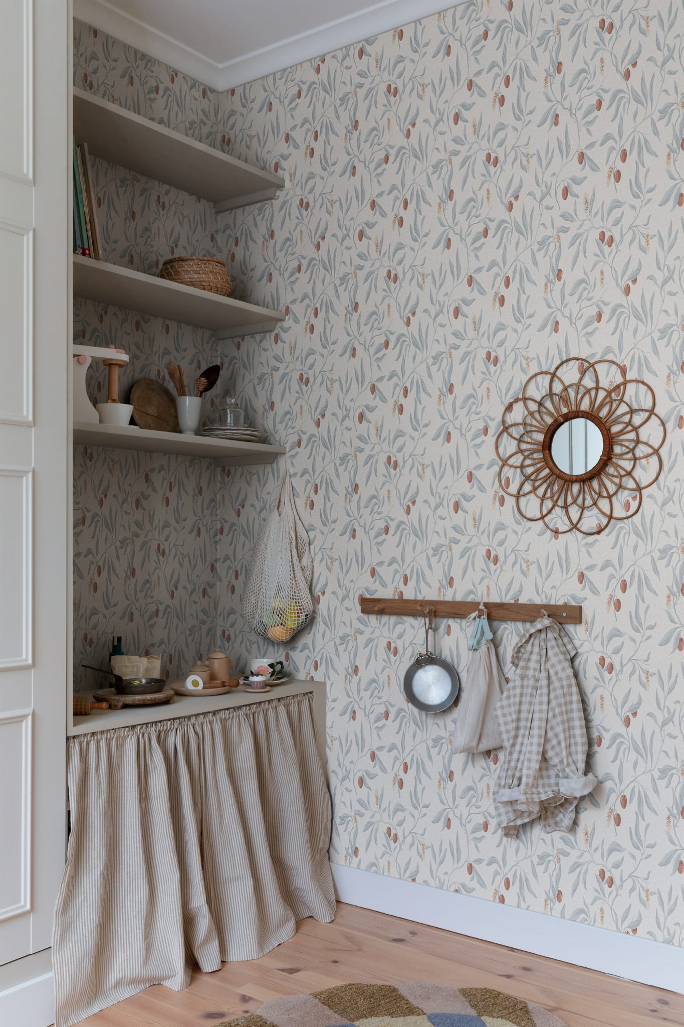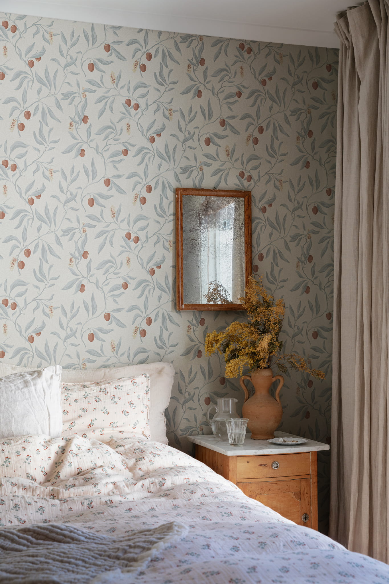 Ekskluzywna tapeta ścienna z kolekcji "Villa Dallarö II", szwedzkiego producenta Sandberg. Projekt "Vinnie", którego autorką jest Sara Bergqvist to piękne, malowane gałązki z owocami liczi. Na drugim tle można dostrzec może drobniutkich, delikatnych listków. Ponadczasowy wzór wykonany tradycyjną techniką druku, która nadaje tapecie teksturowaną powierzchnię i żywy charakter. Kompozycję charakteryzuje delikatna i spokojna kolorystyka, która łączy chłodne, zszarzałe odcienie niebieskiego z bladą szarością, bielą oraz ciepłym brązem i beżem. Wykończenie tapety jest matowe a jej struktura bardzo delikatnie tłoczona. Pod palcami można nieco wyczuć niektóre elementy wzoru. Tapeta świetnie nadaje się, zarówno do nowoczesnych, jak i klasycznie urządzonych wnętrz. Szczególnie pięknie będzie współgrać z ciepłym, rustykalnym wystrojem. W wyjątkowy sposób odmieni styl salonu, jadalni, sypialni, przedpokoju, biura, czy też młodzieżowego a nawet i dziecięcego wnętrza. Tapeta powodzeniem może stanowić samodzielną dekorację wszystkich ścian w pomieszczeniu, jak i tworzyć modne zestawienie z innymi tapetami z kolekcji, na przykład tymi, które prezentujemy poniżej .Tapeta o numerze S10192 jest tapetą flizelinową, ekologiczną, zmywalną w dobrym stopniu, dzięki czemu może być bardzo delikatnie przecierana ściereczką.