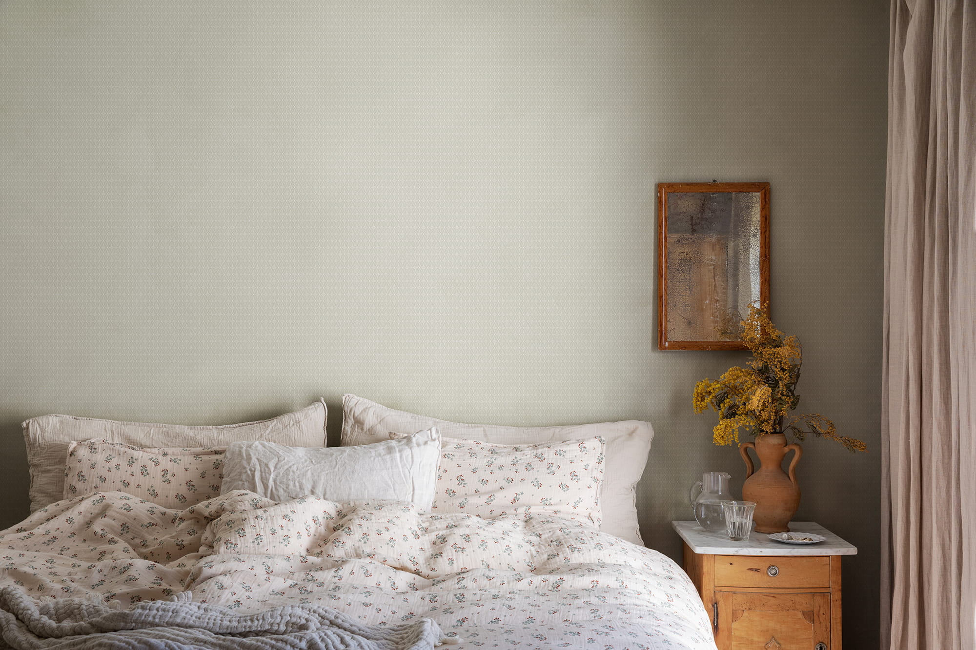 Ekskluzywna tapeta ścienna z kolekcji "Villa Dallarö II", szwedzkiego producenta Sandberg. Projekt "Einar" to delikatna, wzorzysta tapeta w małe romby, które wypełniają drobniutkie, kwiatowe elementy. Kompozycja utrzymana w pastelowej kolorystyce, która wzmacnia jej przytulny charakter. Dominuje jasna, chłodna zieleń, uzupełniona o biel i akcenty połyskującego brązu, który w postaci drobniutkich kropek wypełnia środek każdego kwiatka. Struktura tapety jest gładka a wykończenie, z wyjątkiem brązowych kropek jest matowe. Idealny wybór do stworzenia przyjaznej i harmonijnej atmosfery w domu i zmianę wystroju salonu, jadalni, sypialni, przedpokoju czy też pokoju młodzieżowego a nawet i dziecięcego. Tapeta świetnie skomponuje się z rustykalnym wystrojem, jak i nowoczesną aranżacją. Z powodzeniem może być zastosowana jako samodzielna dekoracja całego pomieszczenia, jak i tworzyć modne zestawienie z innymi tapetami z kolekcji, na przykład tymi, które prezentujemy poniżej. Tapeta o numerze S10195 jest tapetą flizelinową, ekologiczną, zmywalną w dobrym stopniu, dzięki czemu może być bardzo delikatnie przecierana ściereczką.