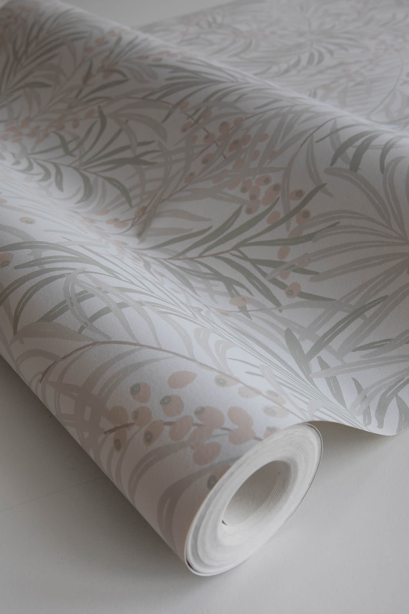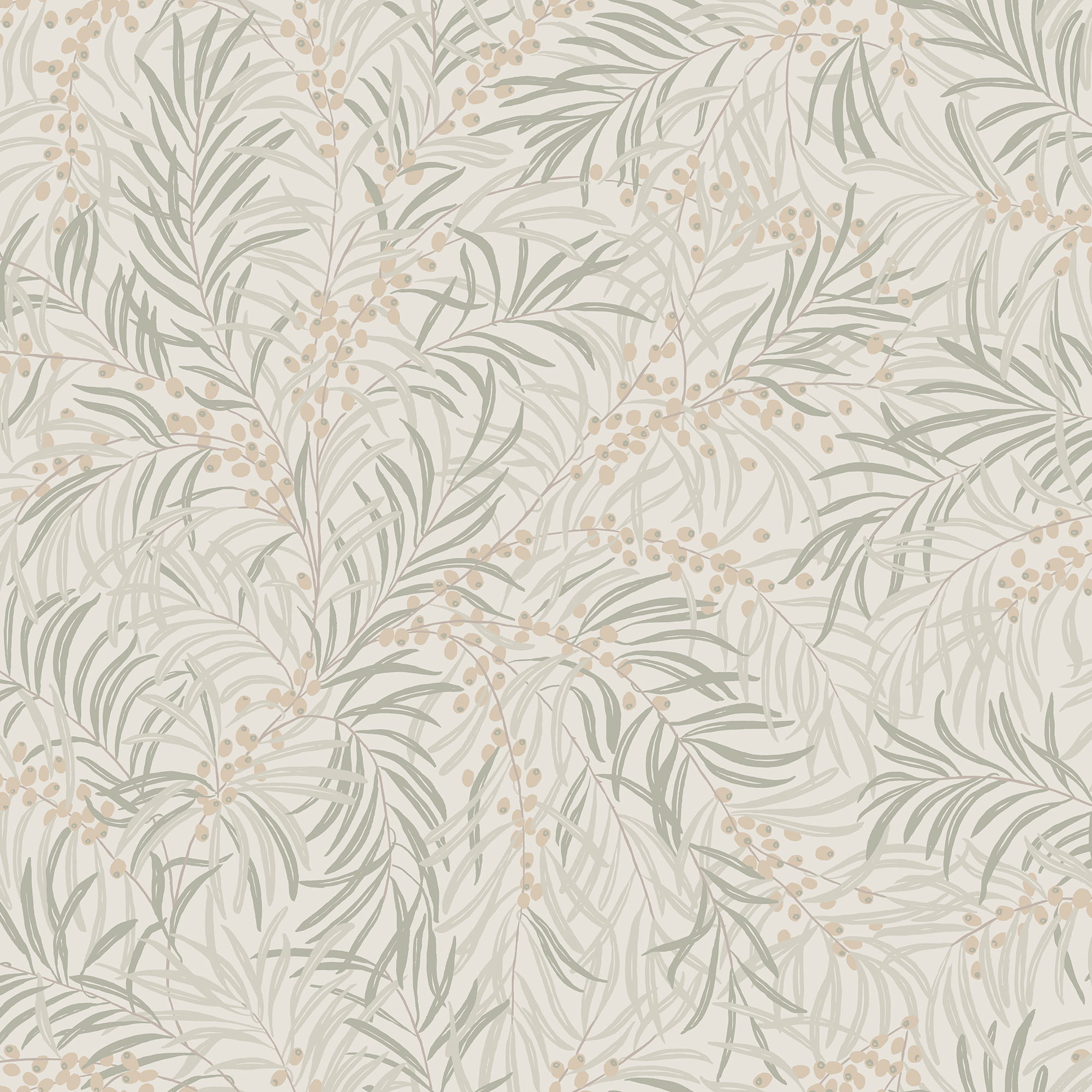 Ekskluzywna tapeta ścienna z kolekcji "Villa Dallarö II", szwedzkiego producenta Sandberg. Projekt "Idun", którego autorką jest Karolina Kroon to delikatny, botaniczny nadruk z rokitnikami, wypełnionych kępami owoców, które wręcz rozsypują się po ścianie. Liście tworzą piękne, małe pióropusze, niczym palmy, które nadają pomieszczeniu tropikalny klimat, charakterystyczny dla nordyckiego stylu. Przytulny charakter kompozycji wzmacnia delikatna kolorystyka tapety, która łączy szarą zieleń, szarość oraz ciepły beż i brąz z białym odcieniem tła. Wykończenia tapety wydaje się być matowe, jednak wzór bardzo delikatnie odbija mocniejsze światło, struktura tapety jest idealnie gładka. Tapeta będzie dobrze współgrać zarówno z nowoczesną, jak i klasyczną aranżacją. Świetnie pasuje do wnętrz rustykalnych i urządzonych w skandynawskim stylu. W wyjątkowy sposób odmieni charakter salonu, jadalni, sypialni, przedpokoju, biura, czy też młodzieżowego a nawet i dziecięcego wnętrza. Może stanowić samodzielną dekorację wszystkich ścian w pomieszczeniu, jak i tworzyć modne zestawienie z innymi tapetami z kolekcji, na przykład tymi, które prezentujemy poniżej. Tapeta o numerze S10206 jest tapetą flizelinową, ekologiczną, zmywalną w dobrym stopniu, dzięki czemu może być bardzo delikatnie przecierana ściereczką.