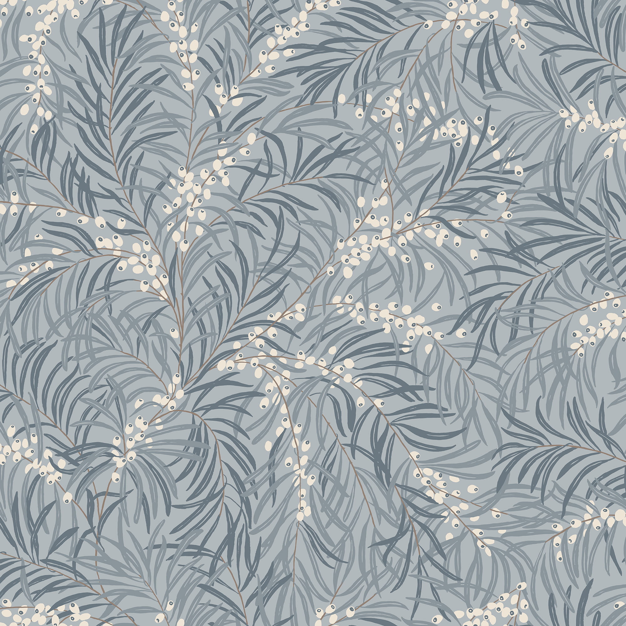 Ekskluzywna tapeta ścienna z kolekcji "Villa Dallarö II", szwedzkiego producenta Sandberg. Projekt "Idun", którego autorką jest Karolina Kroon to delikatny, botaniczny nadruk z rokitnikami, wypełnionych kępami owoców, które wręcz rozsypują się po ścianie. Liście tworzą piękne, małe pióropusze, niczym palmy, które nadają pomieszczeniu tropikalny klimat, charakterystyczny dla nordyckiego stylu. Przytulny charakter kompozycji wzmacnia delikatna kolorystyka tapety, która łączy chłodne, zszarzałe odcienie niebieskiego z bielą. Struktura tapety jest idealnie gładka a wykończenie matowe. Tapeta będzie dobrze współgrać zarówno z nowoczesną, jak i klasyczną aranżacją. Świetnie pasuje do wnętrz rustykalnych i urządzonych w skandynawskim stylu. W wyjątkowy sposób odmieni charakter salonu, jadalni, sypialni, przedpokoju, biura, czy też młodzieżowego a nawet i dziecięcego wnętrza. Może stanowić samodzielną dekorację wszystkich ścian w pomieszczeniu, jak i tworzyć modne zestawienie z innymi tapetami z kolekcji, na przykład tymi, które prezentujemy poniżej. Tapeta o numerze S10226 jest tapetą flizelinową, ekologiczną, zmywalną w dobrym stopniu, dzięki czemu może być bardzo delikatnie przecierana ściereczką.