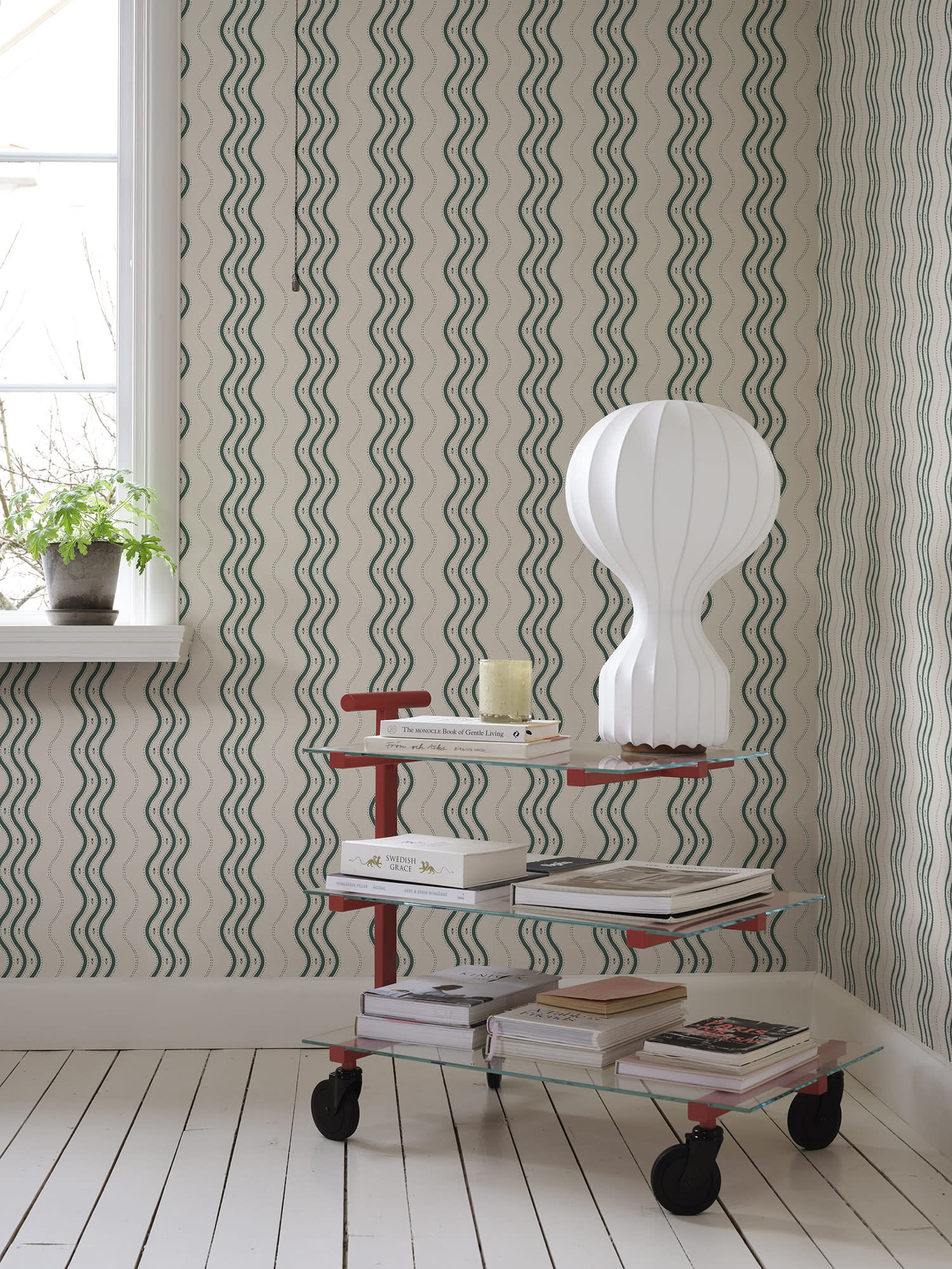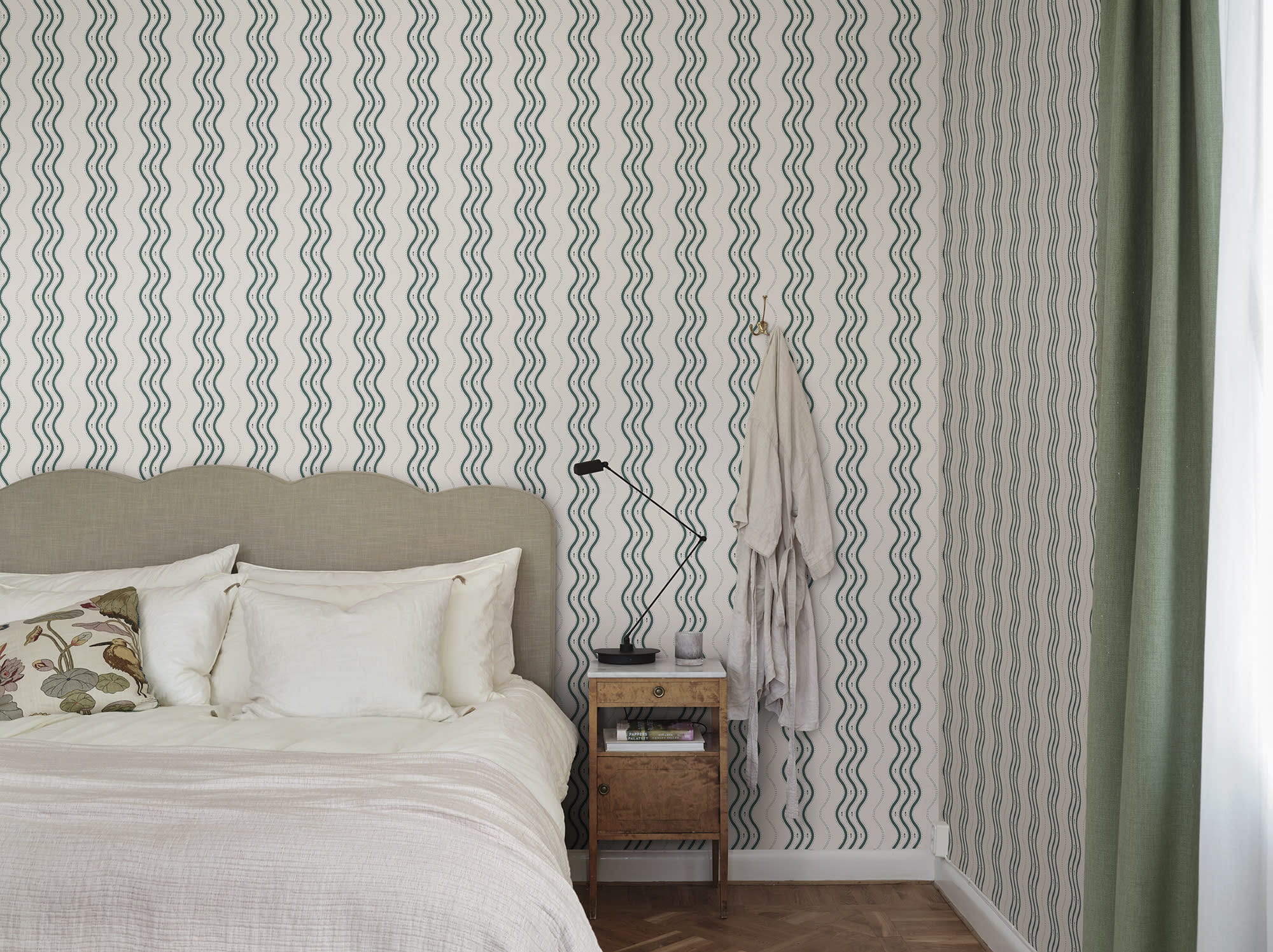 Poszukując modnej i oryginalnej tapety ściennej, warto przyjrzeć się bliżej powyższemu projektowi o nazwie "Ben", który pochodzi z ekskluzywnej kolekcji "Tidlosa", i który powstał przy współpracy z Johanną Bredford i Sanderg. Wyróżnia go oryginalny deseń pasków o odważnym i nieco humorystycznym wyglądzie, który będzie się niezwykle stylowo prezentować na ścianie. Wzór szmaragdowozielonych fal i kropek, okraszonych małymi kwiatami krokusa wypełnia delikatne, kremowe tło. Dekoracyjne walory kompozycji podkreśla matowe wykończenie tapety i jej idealnie gładka struktura. Efektowny i zarazem przytulny motyw będzie doskonałym tłem dla nowoczesnej aranżacji wnętrza. Idealnie sprawdzi się jako dekoracja salonu, jadalni, sypialni, przedpokoju, biura a także młodzieżowego a nawet i dziecięcego wnętrza. Tapeta pięknie będzie prezentować się jako samodzielna dekoracja całego pomieszczenia, jak i tworząc modne zestawienie z innymi tapetami z kolekcji. Tapeta flizelinowa, odporna na zmywanie w stopniu dobrym, dzięki czemu jej powierzchnię można bardzo delikatnie przecierać ściereczką.