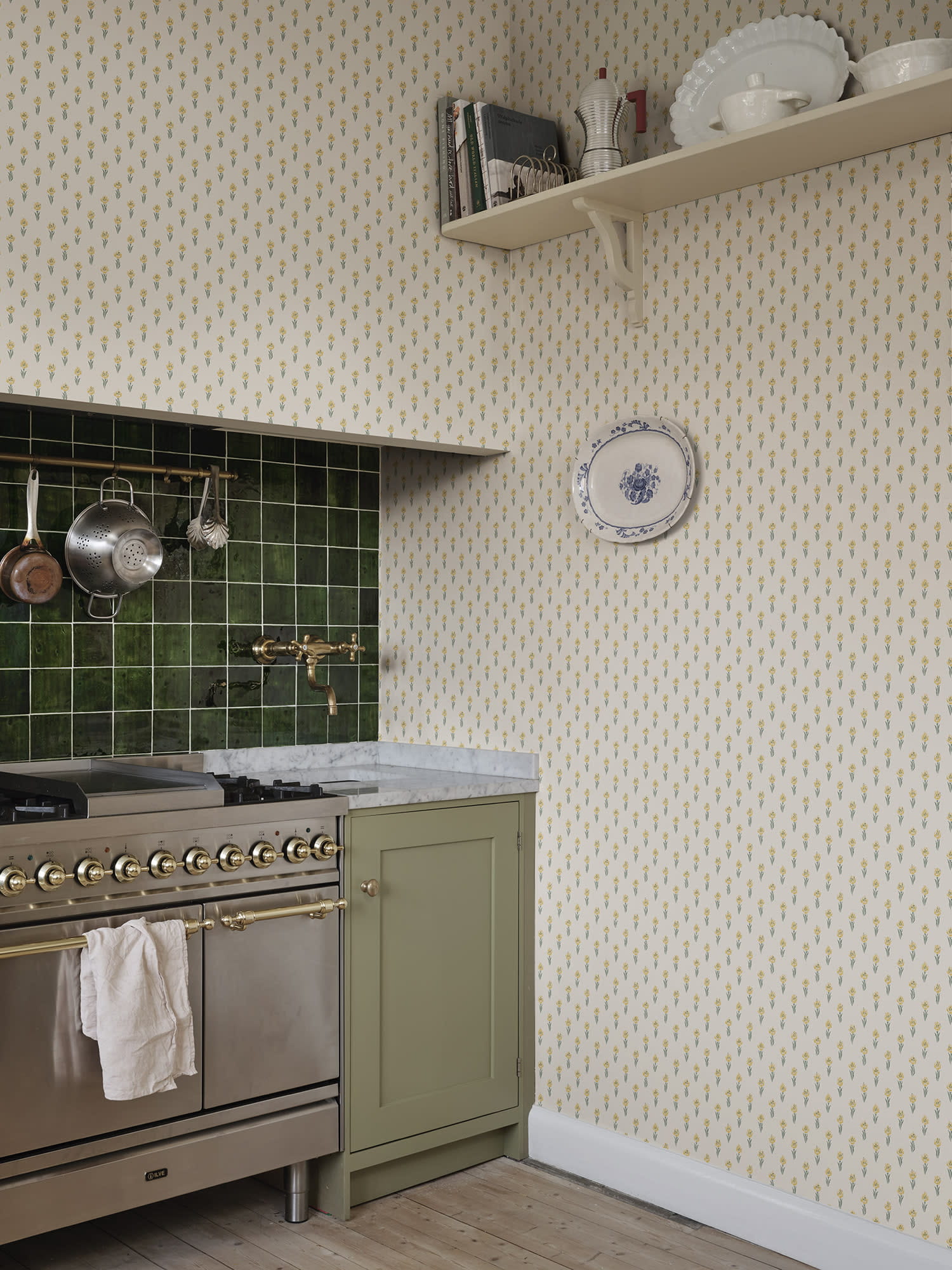 Powyższa tapeta z kolekcji „Tidlosa”, producenta Sandberg, zaprojektowana przez Johannę Sandberg urzeka wyjątkowo delikatnym motywem kwiatowym, składającym się z drobnych, niemal identycznych Krokusów, które z daleka wyglądają niemal jak kropki. Subtelna kolorystyka tapety, będąca zestawieniem bieli z tonacjami żółtego i szarej zieleni podkreśla spokojny i przytulny charakter kompozycji. Struktura tapety jest idealnie gładka a wykończenie matowe. Motyw będzie pięknie współgrał zarówno z klasycznym, jak i nowocześnie urządzonym wnętrzem. Udekoruje salon, jadalnię, sypialnię, przedpokój, gabinet, czy też pokój młodzieżowy a nawet i dziecięcy, nadając wnętrzom stylowego charakteru i ciepłego klimatu. Tapeta może stanowić samodzielną dekorację całego pomieszczenia lub tworzyć modne zestawienie z innymi tapetami z kolekcji. Tapeta flizelinowa, charakteryzująca się dobrą odpornością na zmywanie, dzięki czemu jej powierzchnię można bardzo delikatnie przecierać ściereczką.