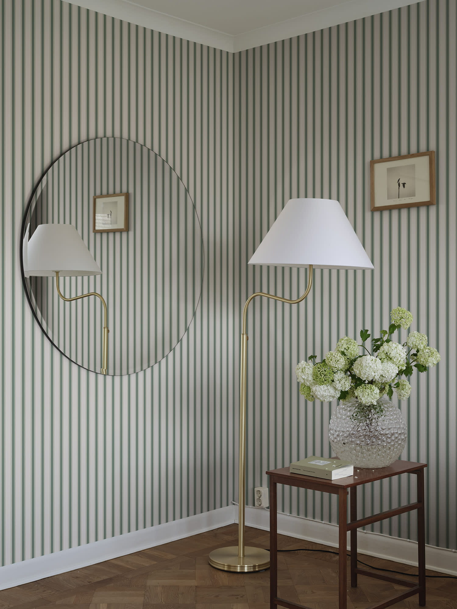 Tapeta z kolekcji „Tidlosa”, producenta Sandberg łączy klasykę, prostotę i elegancję ponadczasowego wzoru pasów. Nienachlana kolorystyka tapety, będąca zestawieniem bieli z ciemną zielenią sprawia, że całość prezentuje się stylowo ale i przytulnie. Wyszukanego stylu dodają drobniutkie, złote kropki poprowadzone wzdłuż pasków, które delikatnie mienią się w świetle. Struktura tapety jest idealnie gładka w dotyku. Pasiasty projekt „Gustav” jest inspirowany pięknymi, jedwabnymi zasłonami i tkaninami meblowymi z XVIII wieku. Uniwersalny motyw będzie stylowym dopełnieniem zarówno klasycznej, jak i bardziej nowoczesnej aranżacji wnętrza. Pięknie udekoruje salon, jadalnię, sypialnię, przedpokój, gabinet, czy też pokój młodzieżowy, nadając wnętrzom wyjątkowego charakteru. Tapeta może stanowić samodzielną dekorację całego pomieszczenia lub tworzyć modne zestawienie z innymi tapetami z kolekcji. Tapeta flizelinowa, charakteryzująca się dobrą odpornością na zmywanie, dzięki czemu jej powierzchnię można bardzo delikatnie przecierać ściereczką.